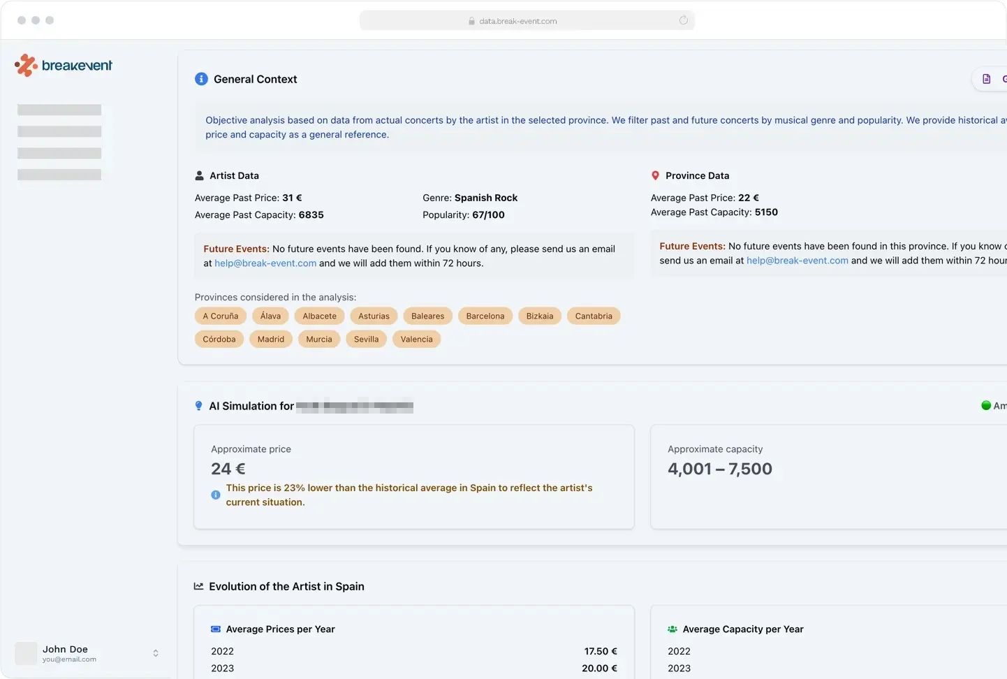 We offer access to the largest concert database in Spain for music industry professionals (and it keeps growing...). We leverage this data to give you the best possible context for your next event.